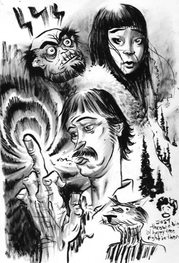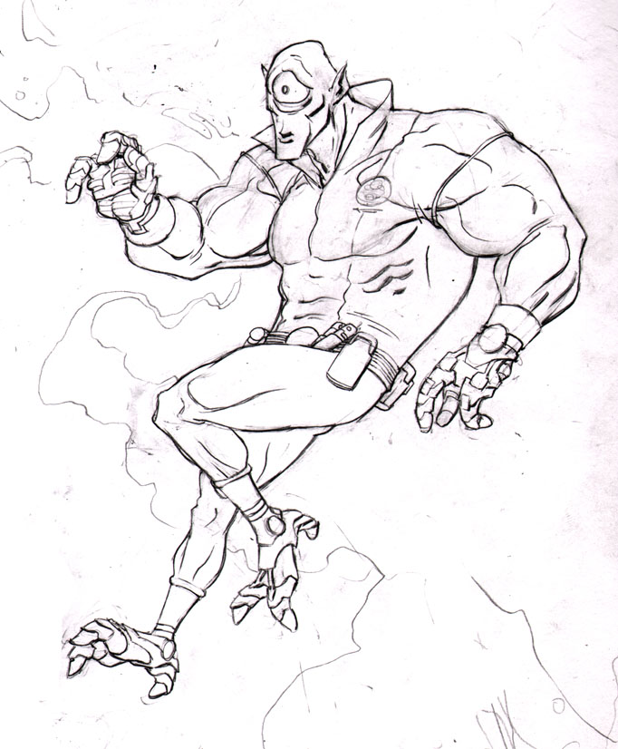 I tried for a squid in spandex with boobs…but I hated it. Sounded like surefire gold. Sorry. This guy started out as a kind of PI and just turned into more of a tourist. I like his face. Probably should have had him holding some crazy dame’s sorted evidence instead of a suitcase.